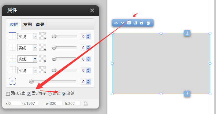 二、选中模块,点击属性 设置固定显示 (勾选)(如果需要固定在底部需要把模块放在底板中,勾选时会显示底部。)
