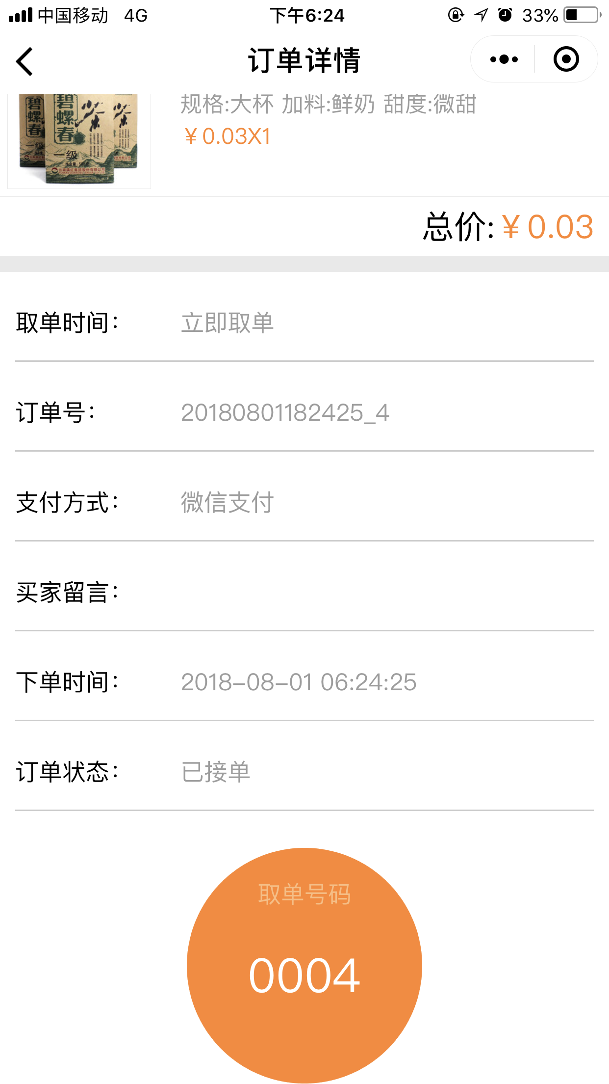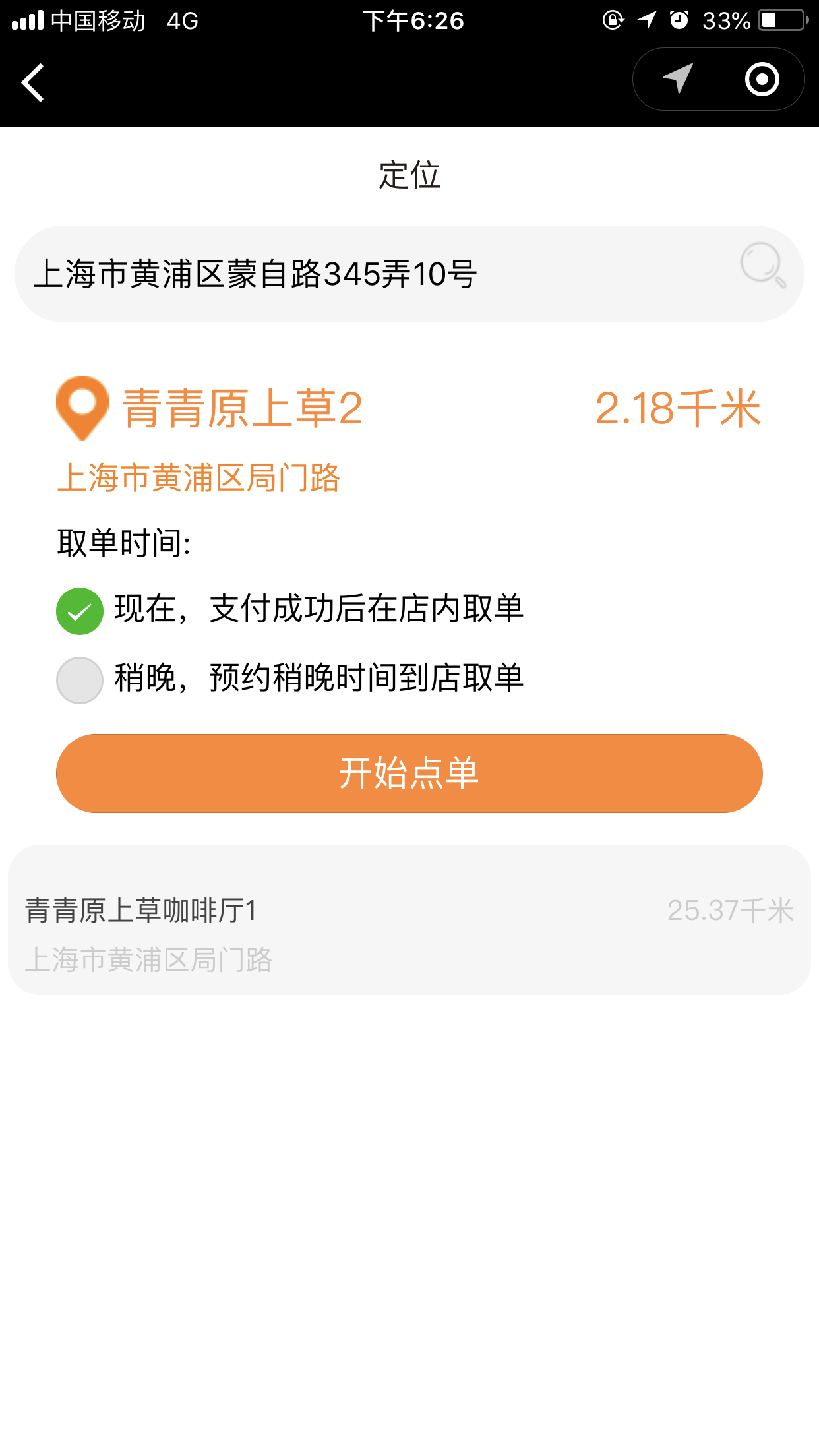 4.在前台,用户点击“开始点单”可以根据位置匹配到最近的店面,并且可以选择取餐的方式“立即取餐”或“稍晚取餐”,进入点单列表页我们添加菜品时,可以选择我们在后台添加的“配料”、“口味”、以及“规格”等,选择完毕之后,点击“去结算”跳转到提交订单页面,取单时间根据用户的选择会显示为“立即取单”或者为“取单的时间点”,提交订单后,会跳转到“订单详情”页面,当商家在后台点击“接单”接单后,会有“取餐码”显示出来,如图所示: